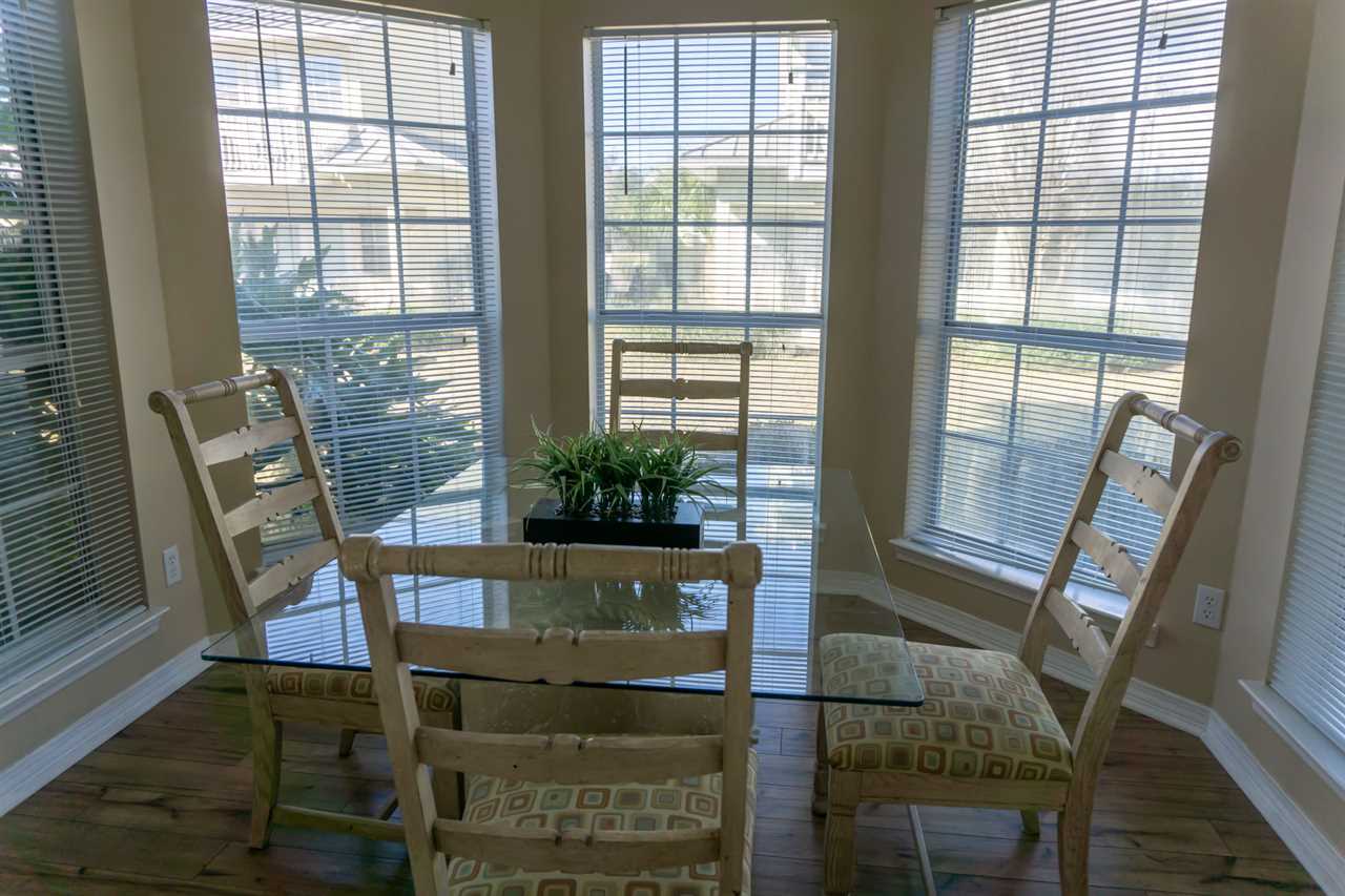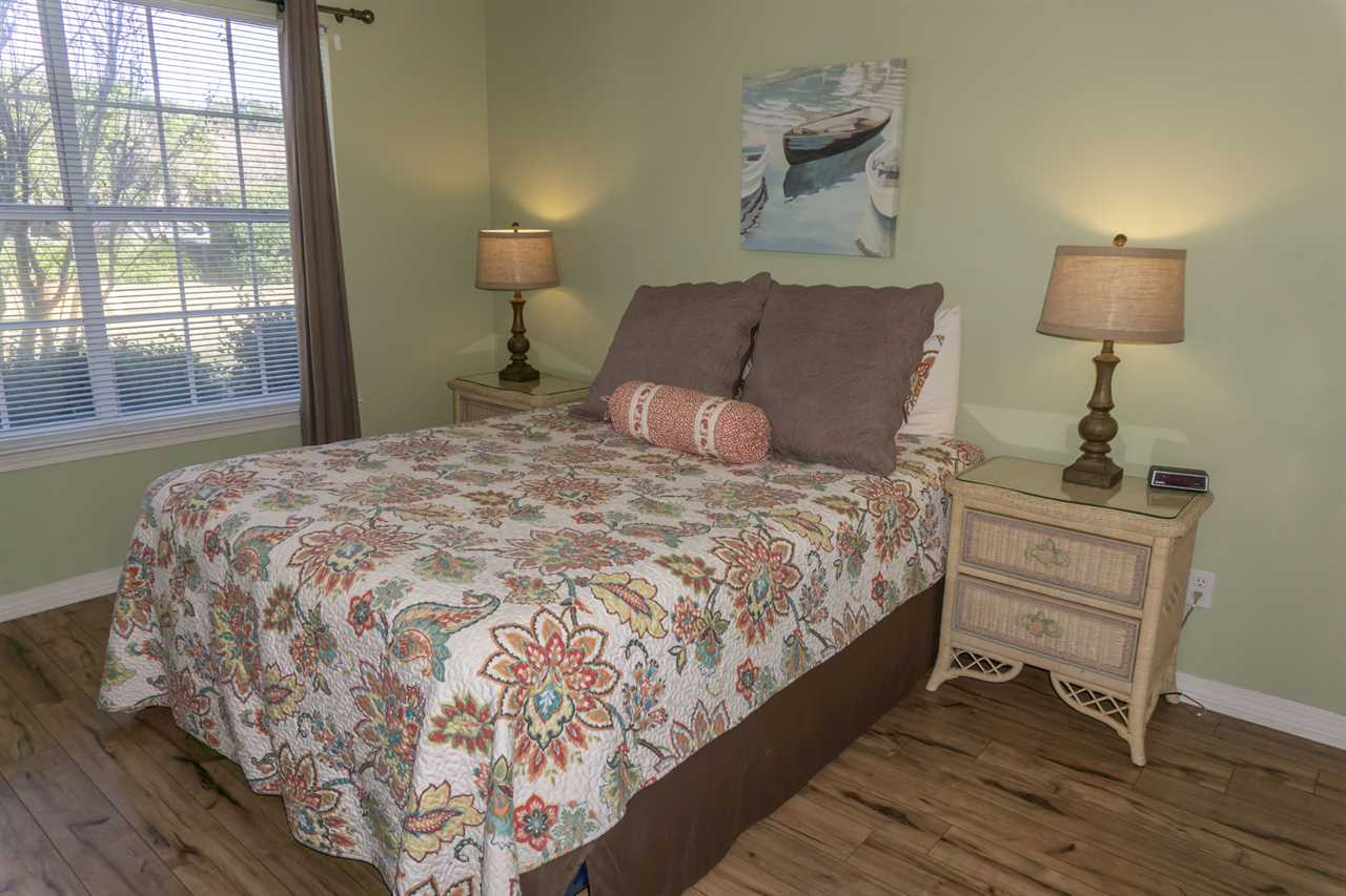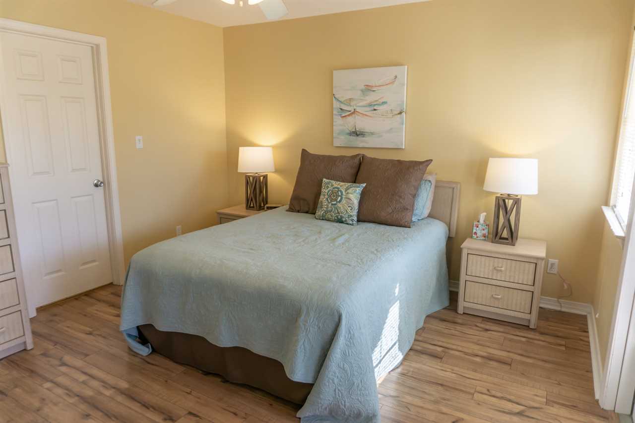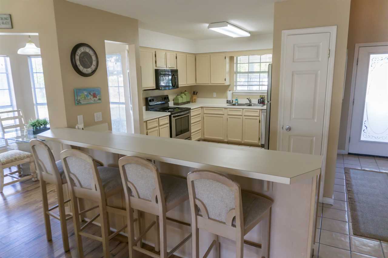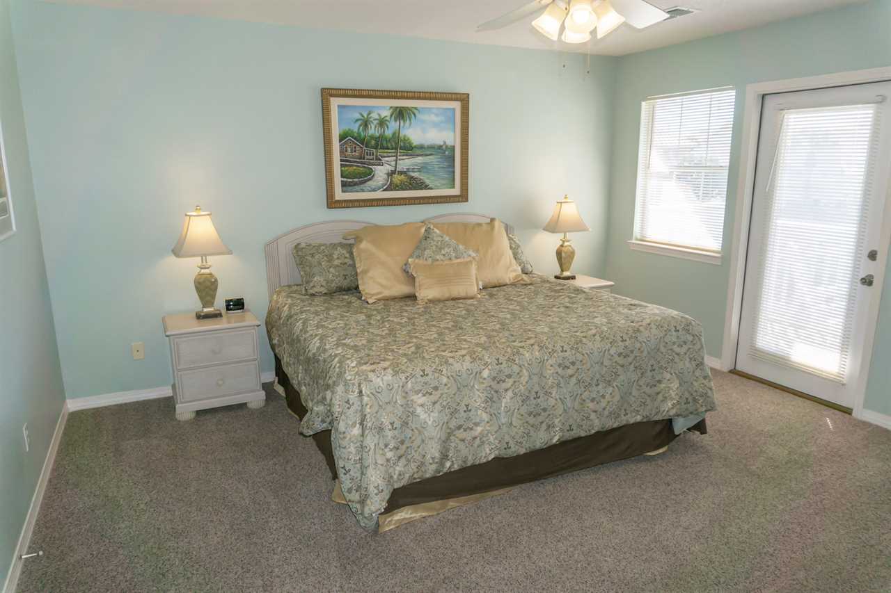 The security and privacy of a completely gated and guarded community adds extra peace of mind for all of Mainsail's guests. Our driveway can easily park three vehicles and our three bedrooms and loft easily sleep up to our twelve person capacity. Our cottage has all the conveniences of home including all kitchen equipment, linens, towels, and full size washer and dryer. The carport provides shade and cover while you carry in groceries to the conveniently located kitchen on the ground level. The two bedrooms on the ground floor have queen beds and share a full bath. The master suite is the entire second floor. A spacious bedroom with king bed and TV opens to a private deck overlooking one of the pools. The master bath has his and her vanities with a walk in shower and stand alone Jacuzzi tub. The third level loft has an open concept with a queen bed, a single bed, and a set of bunk beds, and a full bath. Enjoy incredible sunrises and sunsets from the private third floor open deck!