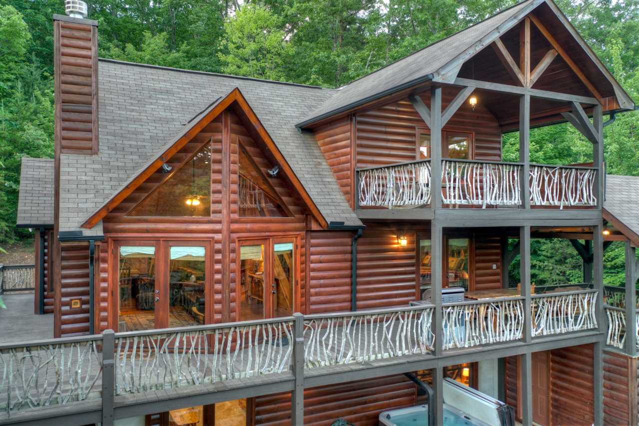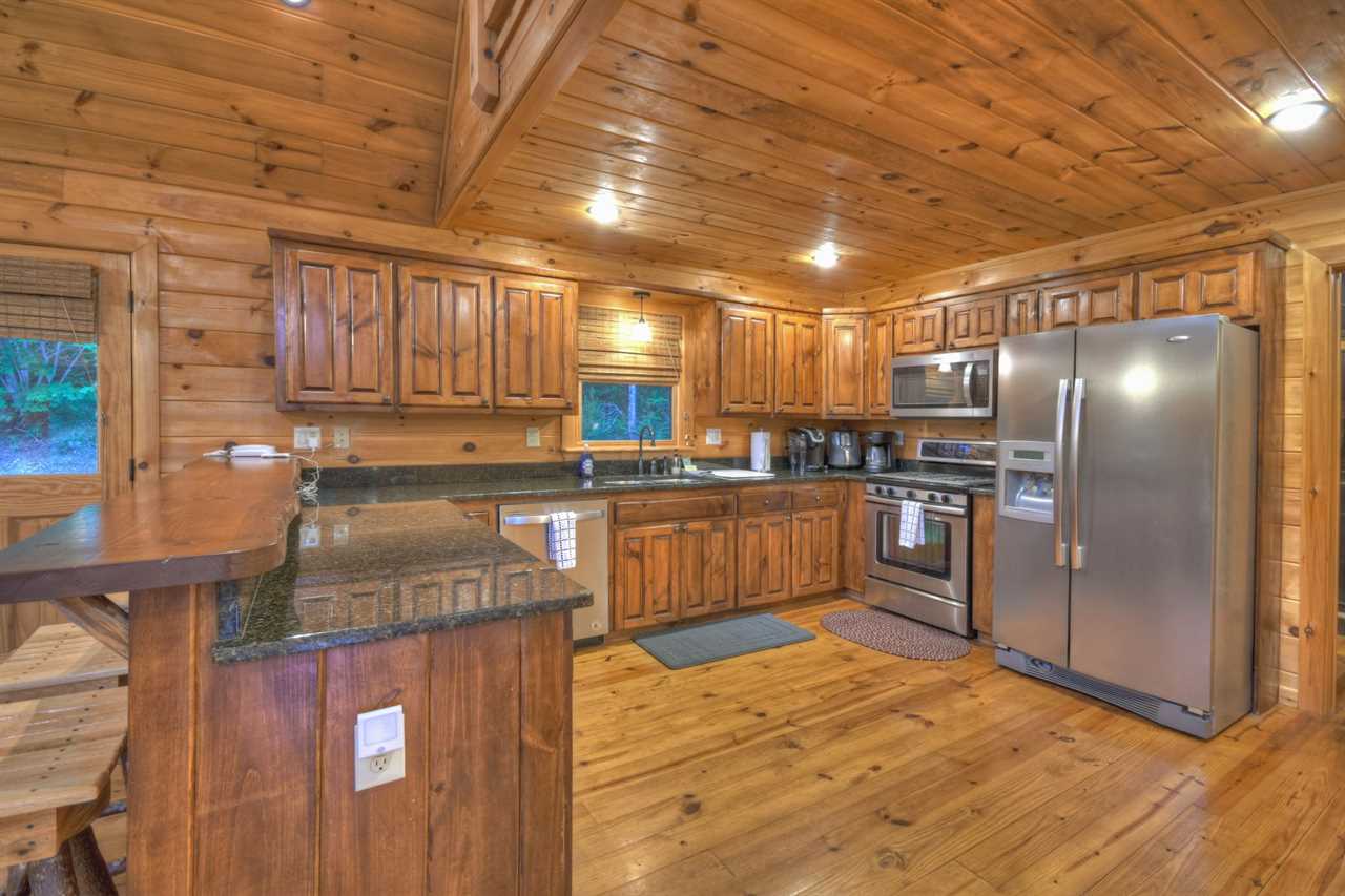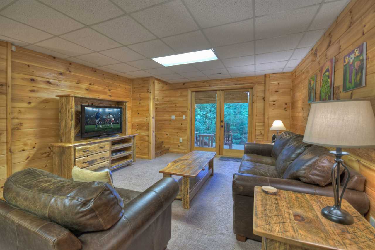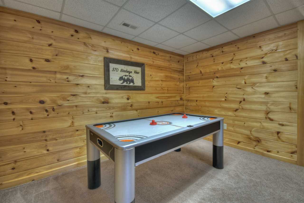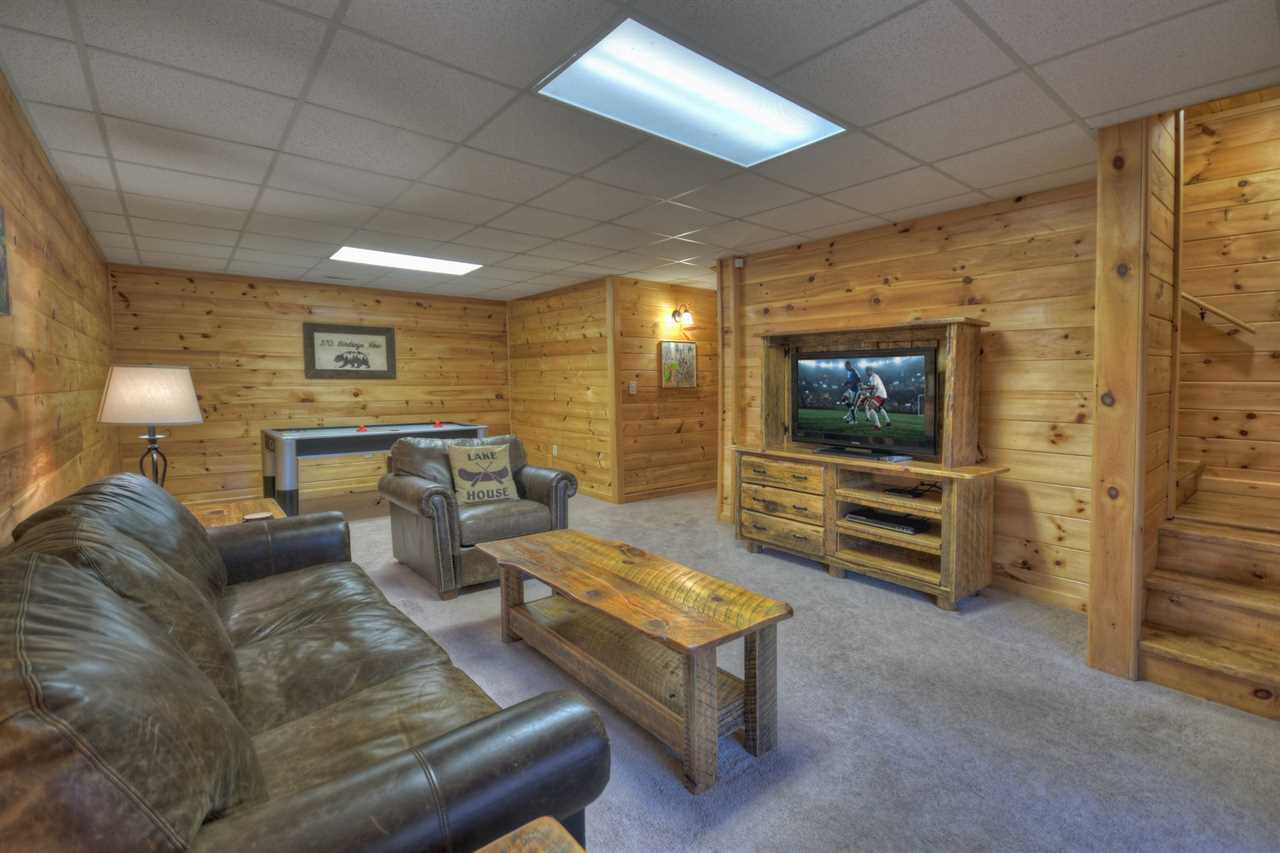 With cathedral ceilings, a luxury fully-equipped kitchen, a dining space, and all of it overlooking stunning mountain views, the main floor is extremely opulent. There is a gas log fireplace with stone from the floor to the ceiling. Take your morning coffee outside and take in the sounds of nature on the covered and open decks. A second living room and a game room with an air hockey table are available on the lower floor. To enjoy a family picnic and s'mores, there is a terrace-level deck with a large hot tub and a newly constructed fire pit below.