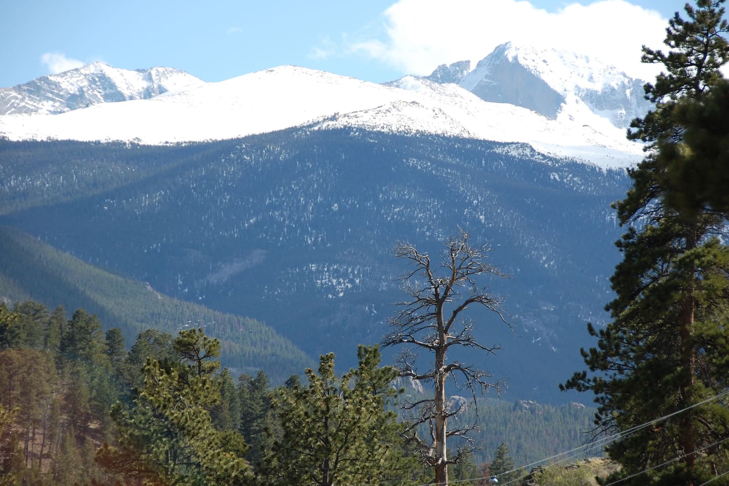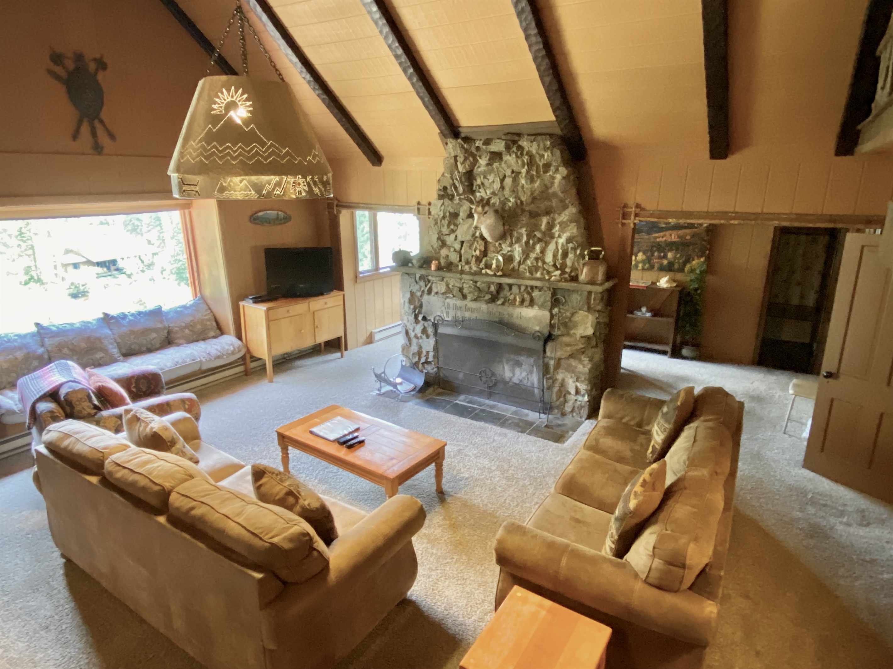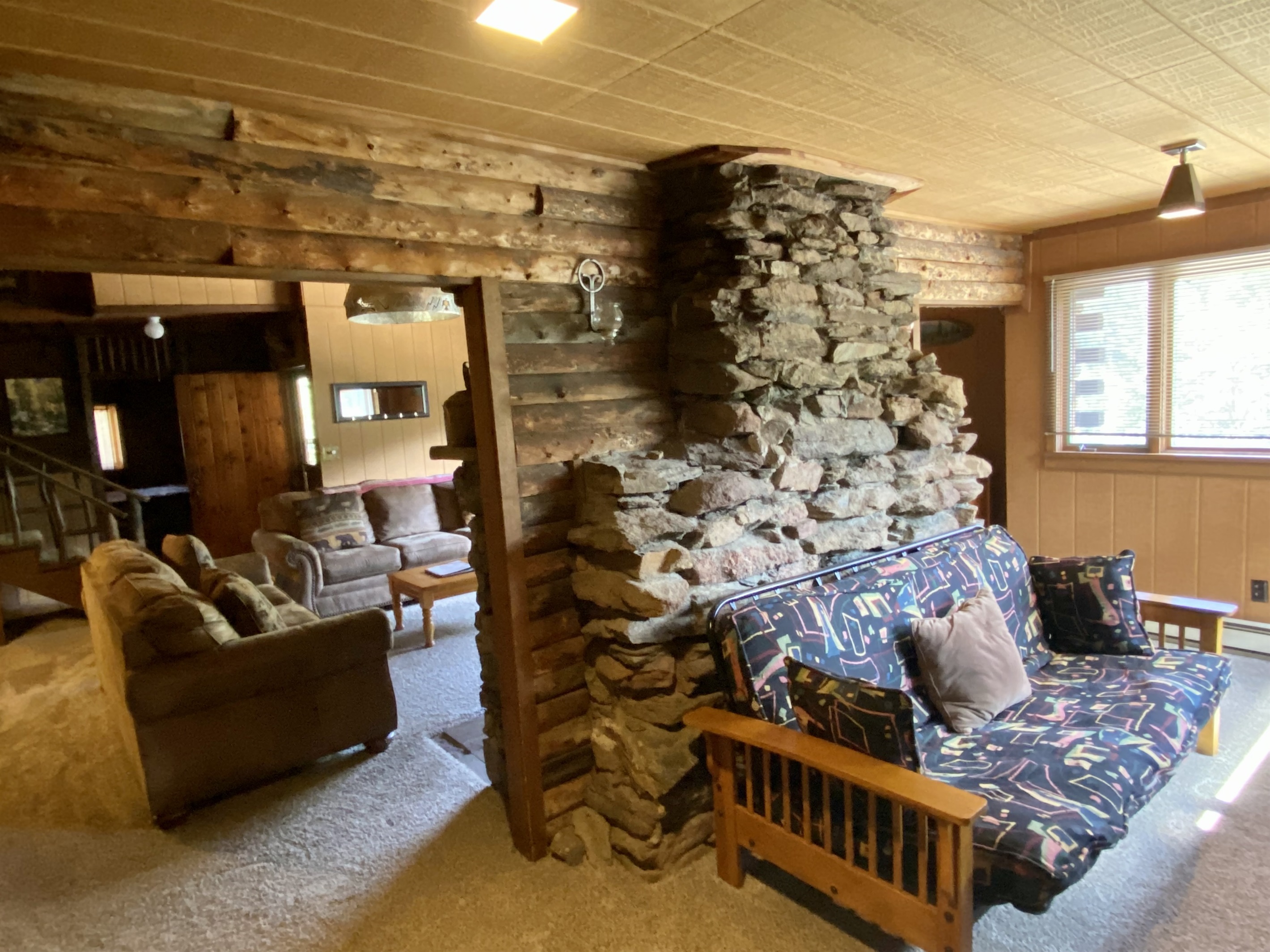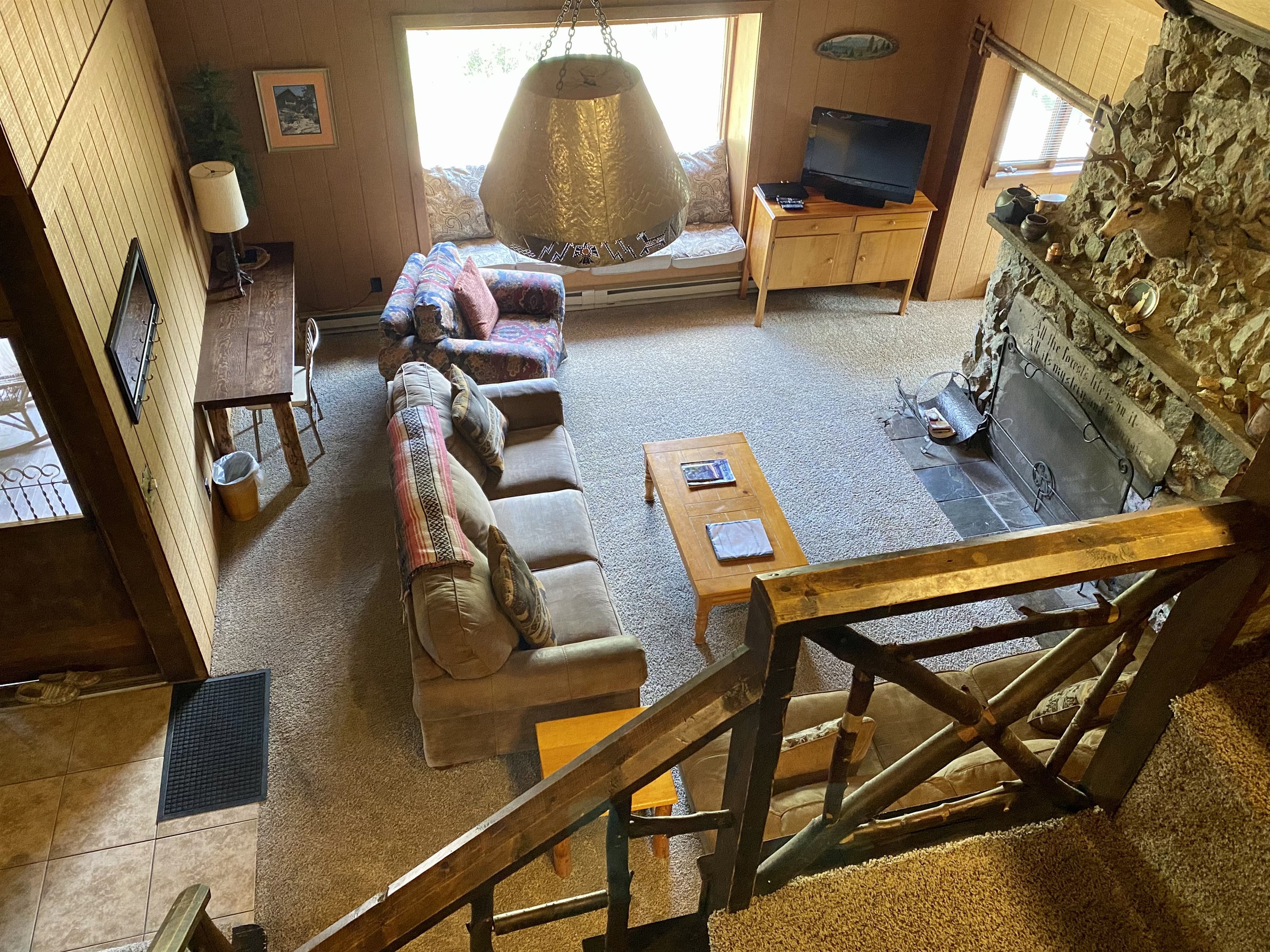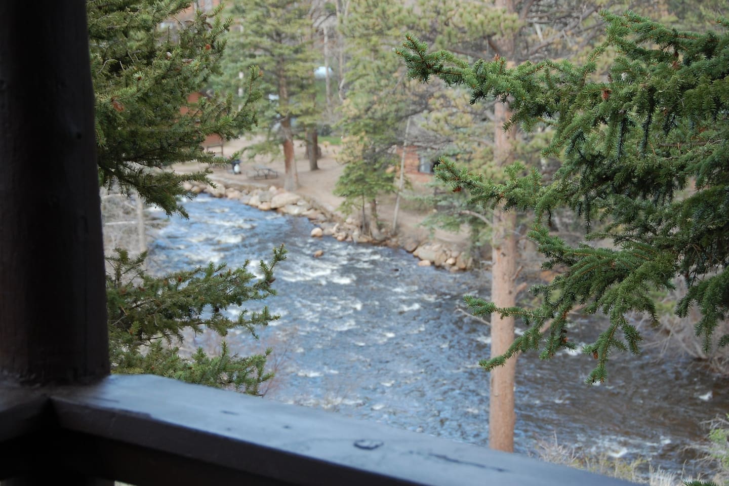The living area has a vaulted ceiling, large fireplace, smart TV with DVD and a large picture window with views of Longs Peak and the river.