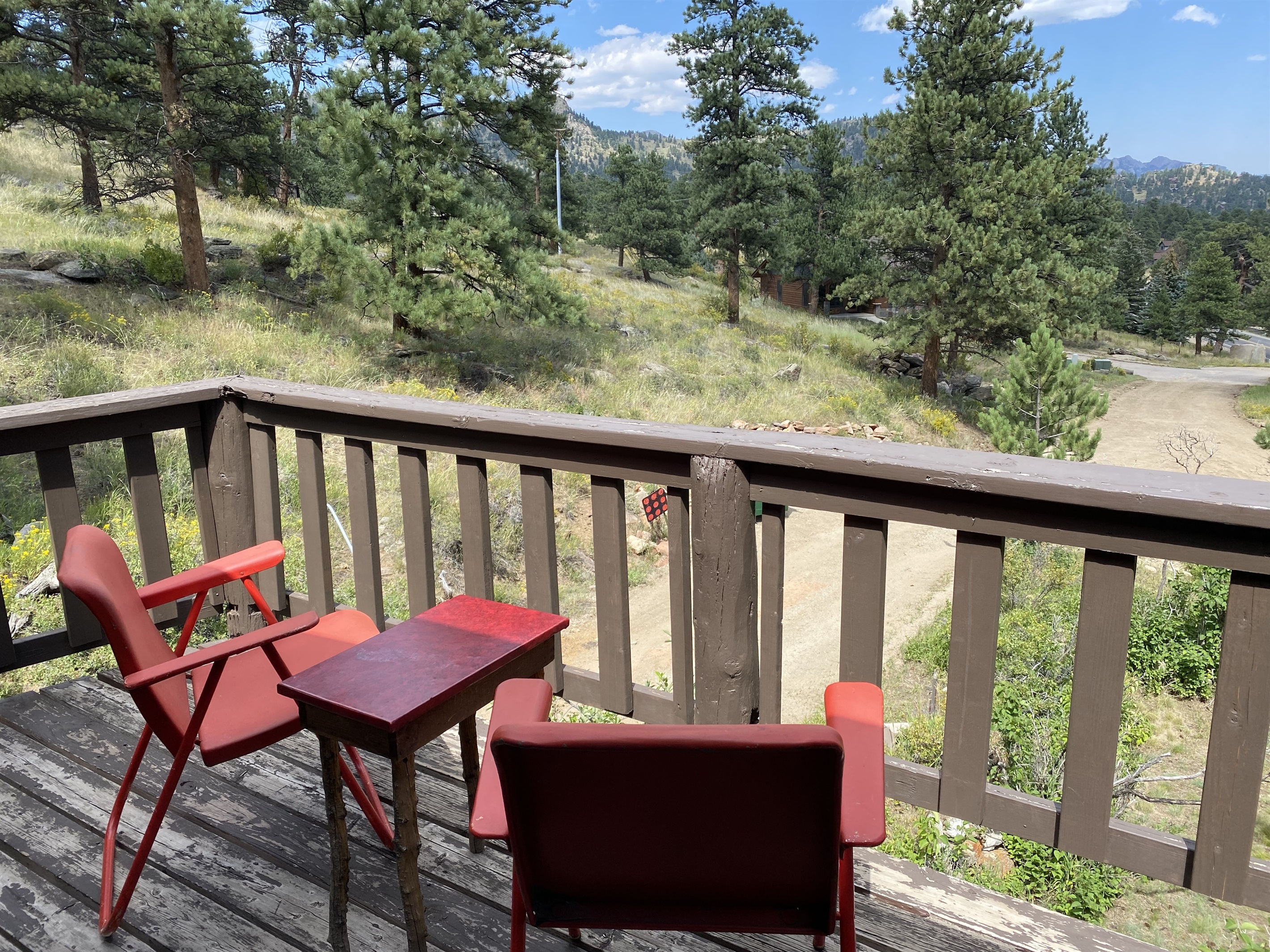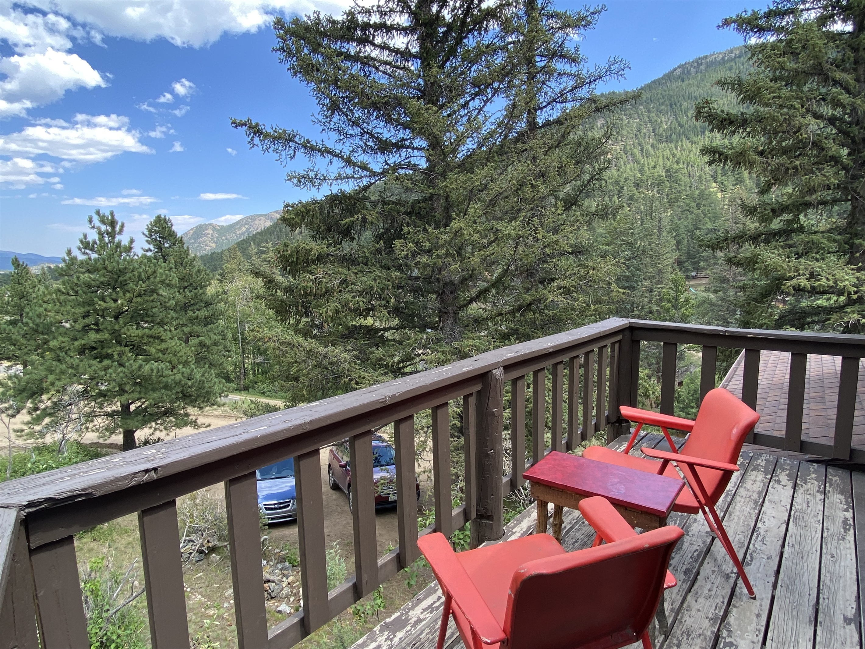 The upstairs master suite is a spacious 21 X 11, with a pillowtop king bed, smart TV with DVD player, desk and sitting area. It also has its own private outside deck with an unobstructed view toward Estes Valley. Please note, the ceiling of this room is a bit low and it has an open doorway to the loft below.