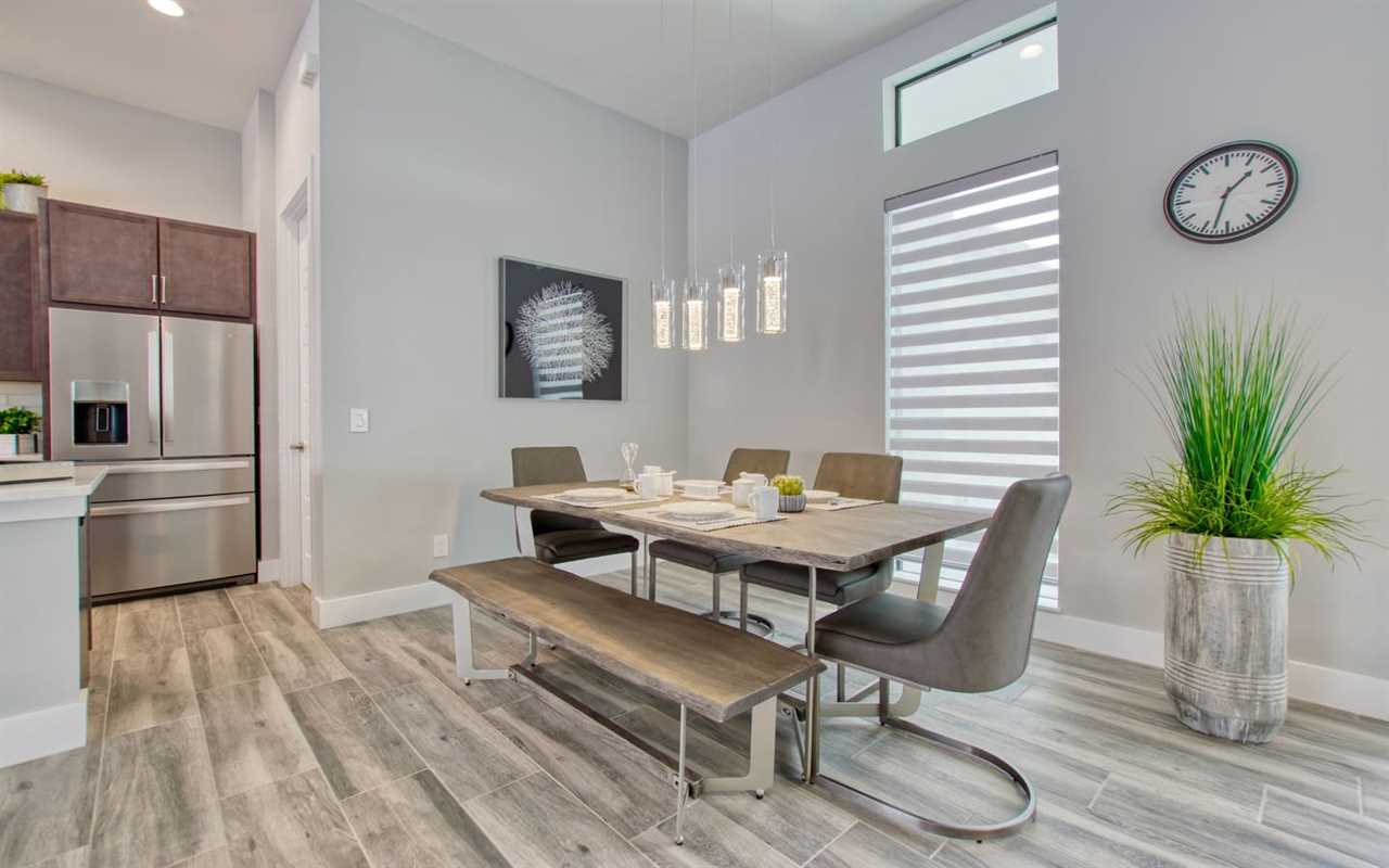 Inside you'll find an open living, kitchen, and dining space with wood floors throughout. The living space hosts comfortable couches where you can gather to spend time with loved ones or watch a movie or TV show on the wall-mounted flat screen TV. Prepare everyone's favorite meals in the fully equipped kitchen featuring stainless steel appliances and expansive counters, including a kitchen island with bar seating for four. Enjoy the meal at the dining table that seats everyone. Open the large sliding wall of windows to join the indoor and outdoor spaces into one.